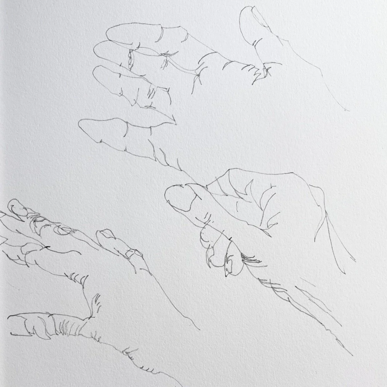 I confess that I struggled a bit with the pure contour drawing — not so much because it didn’t produce a ‘good’ drawing (in its way, the marks are interesting), but more because I was unsure when to follow one crease, one line, rather than another. Perhaps I had not fully left the L-mode behind; I was making decisions rather than just looking. In contrast, I found Nikolaides’ exercise rewarding. The hands I drew are demonstrably my hand and yet not my hand. I like the fractured quality of them — the slippage, for example in Contour drawing 1, between hand and wrist, and between one phalange and the next phalange in each finger. This fracturing of the hand seems to capture something of the movement of which a hand is capable. In contrast, the drawings below are ones that I did a couple of years back whilst looking both at my hand and at my drawing. They are ‘better’ drawings, nor ‘worse’ drawings; simply different.